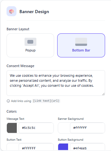 The Banner Design section gives you full control over how your cookie consent banner looks. Customize colors, typography, positioning, and more to create a seamless experience that matches your brand.
