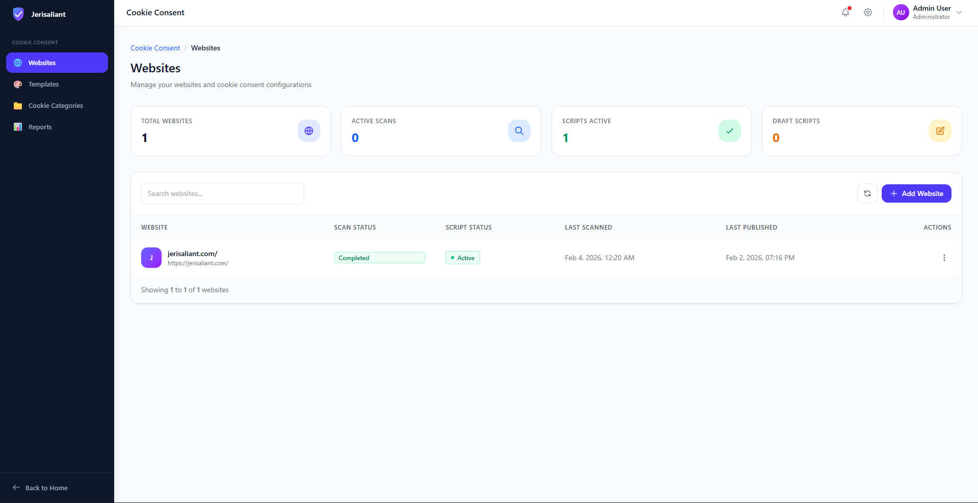 From your Jerisaliant dashboard, click on the Cookie Consent card to access the module. Here you can manage all your websites and their consent configurations.