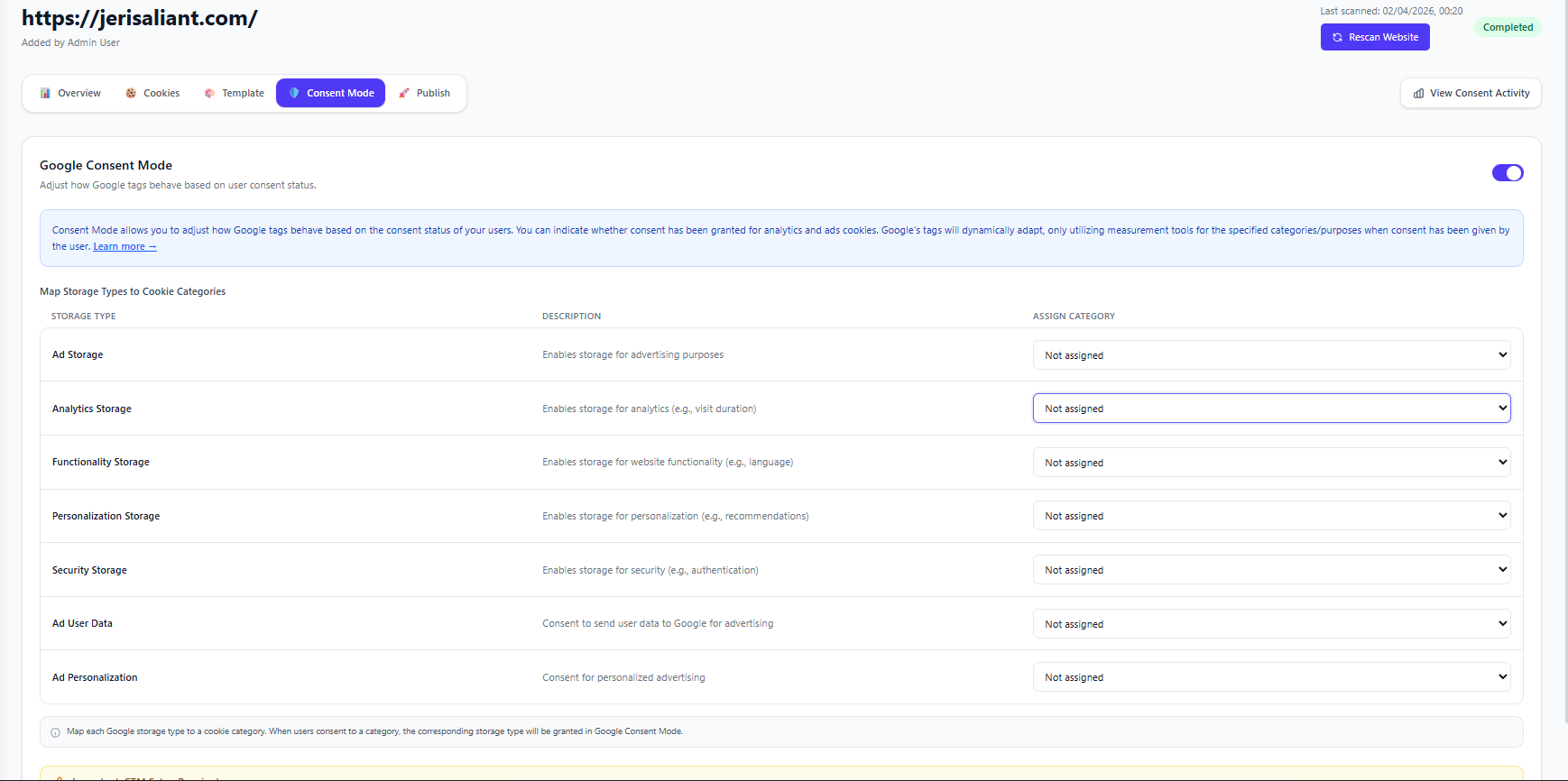 After scanning your website, go to the Consent Mode tab in your website dashboard.