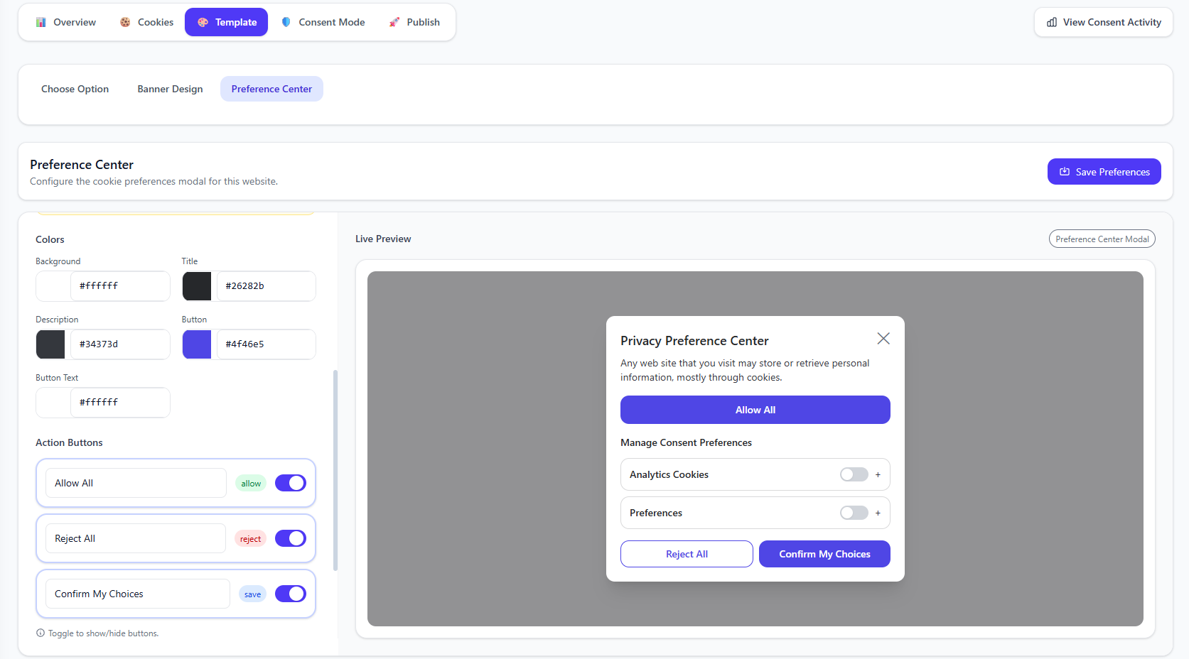Give users granular control over their cookie preferences with a comprehensive preference center.