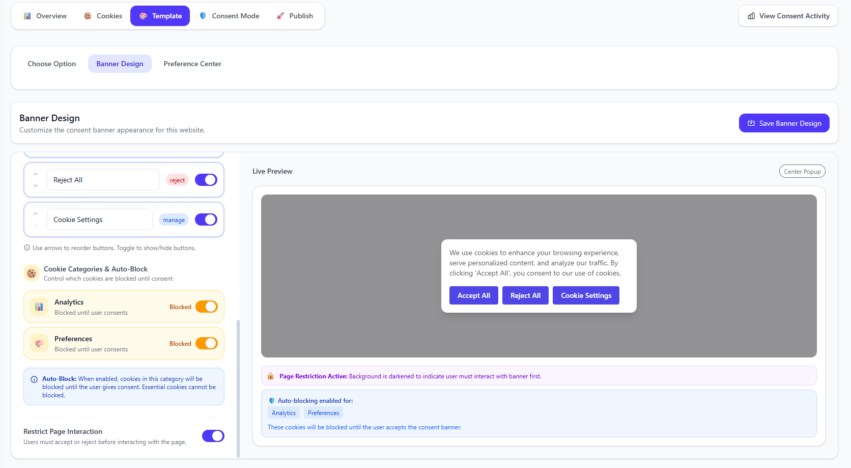 The Banner Design section gives you full control over how your cookie consent banner looks. Customize colors, typography, positioning, and more to create a seamless experience that matches your brand.