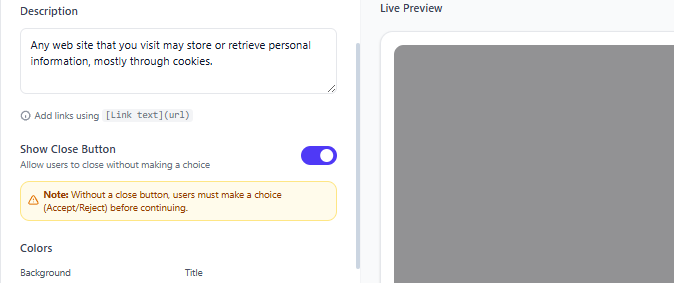 Choose whether to show a close button on the preference center. If you require explicit consent, you can remove the close button to ensure users must make a choice (Accept All, Reject All, or Save Preferences) before continuing.
