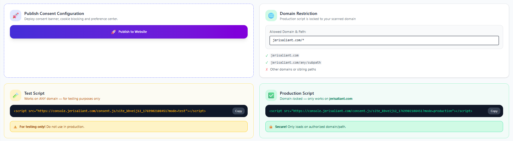 The production script only works on the authorized domain/path shown in the Domain Restriction section. Using it on other domains will fail to load. Always use the test script for development and staging environments.
