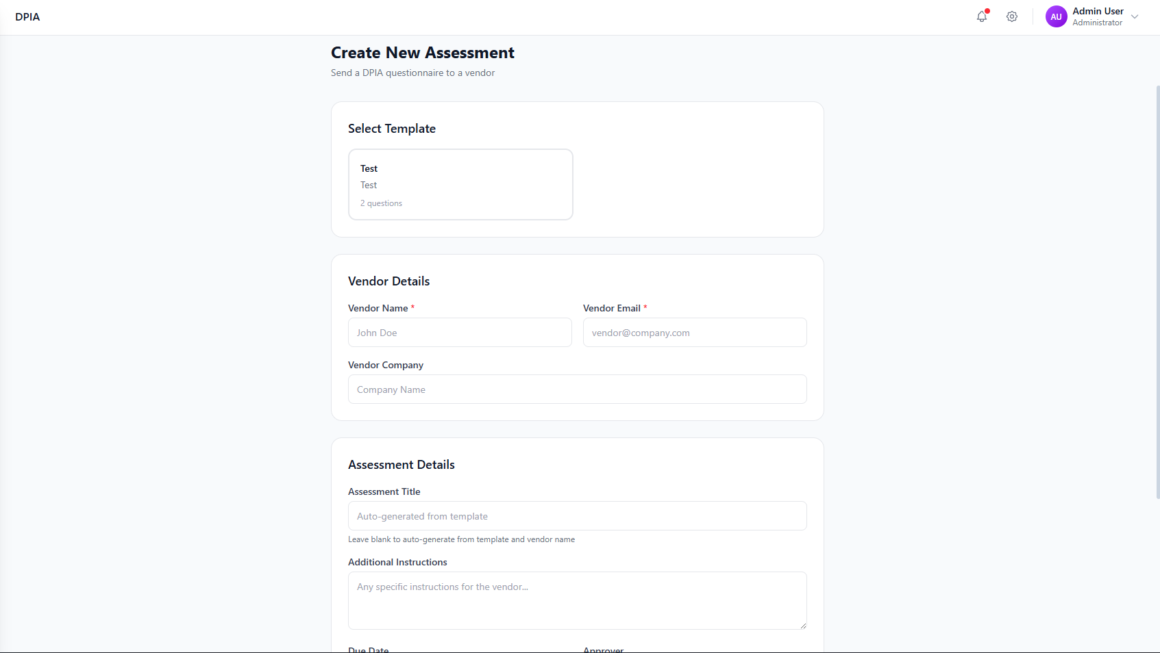 Create New Assessment form showing template selection and vendor details